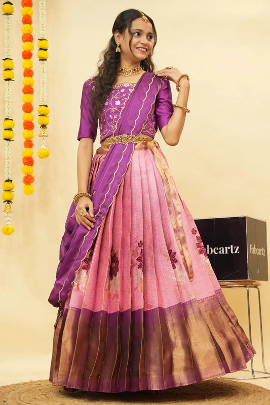 Pranavi Women's Woven Design zari work Half Saree with Embroidered Blouse and Dupatta