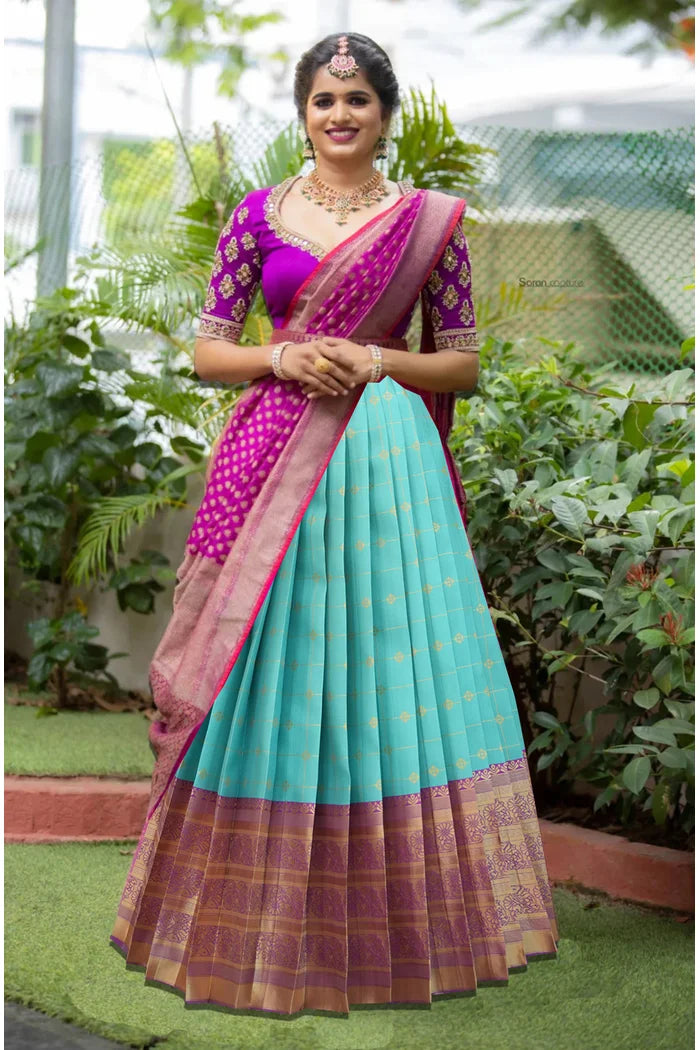 (Adhira) South Indian Festival Traditional Half Saree with Embroidered Blouse & Dupatta