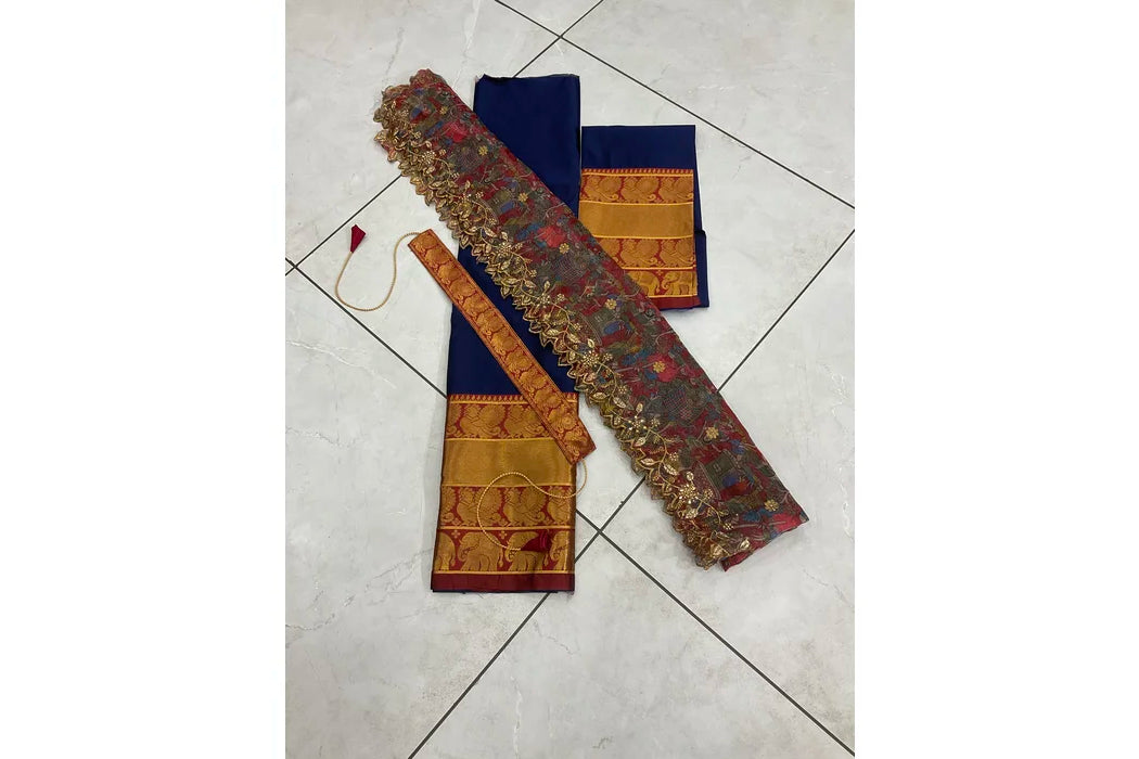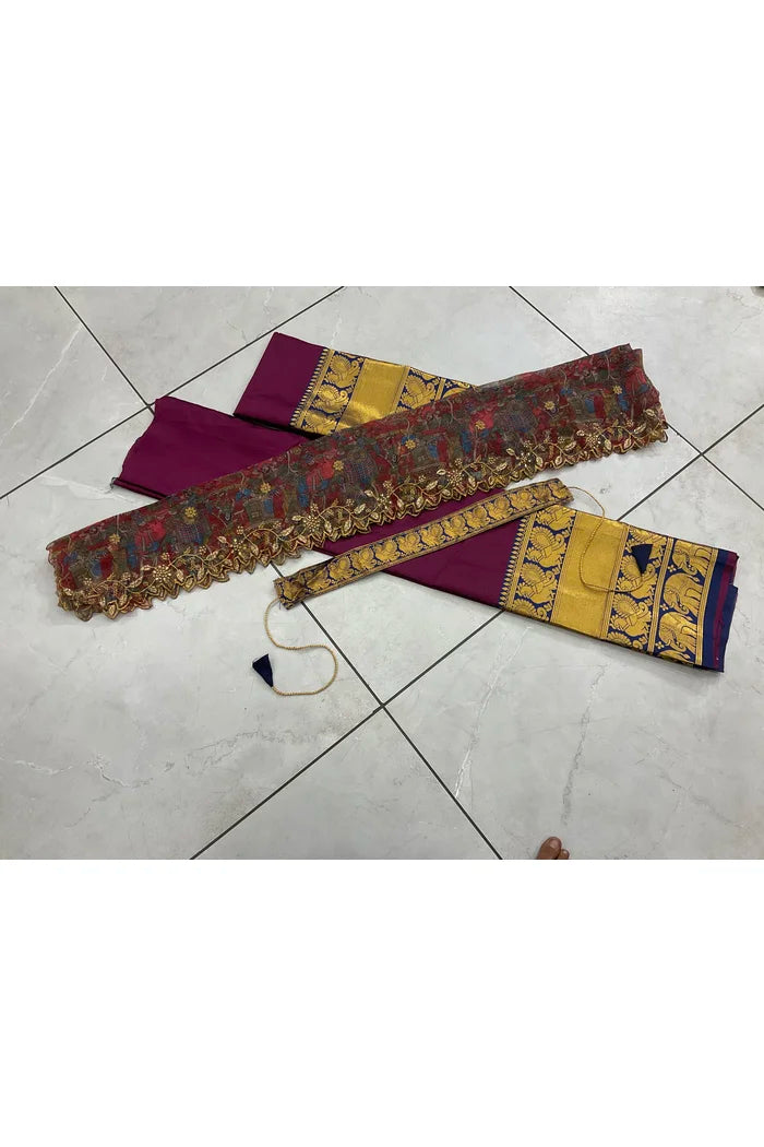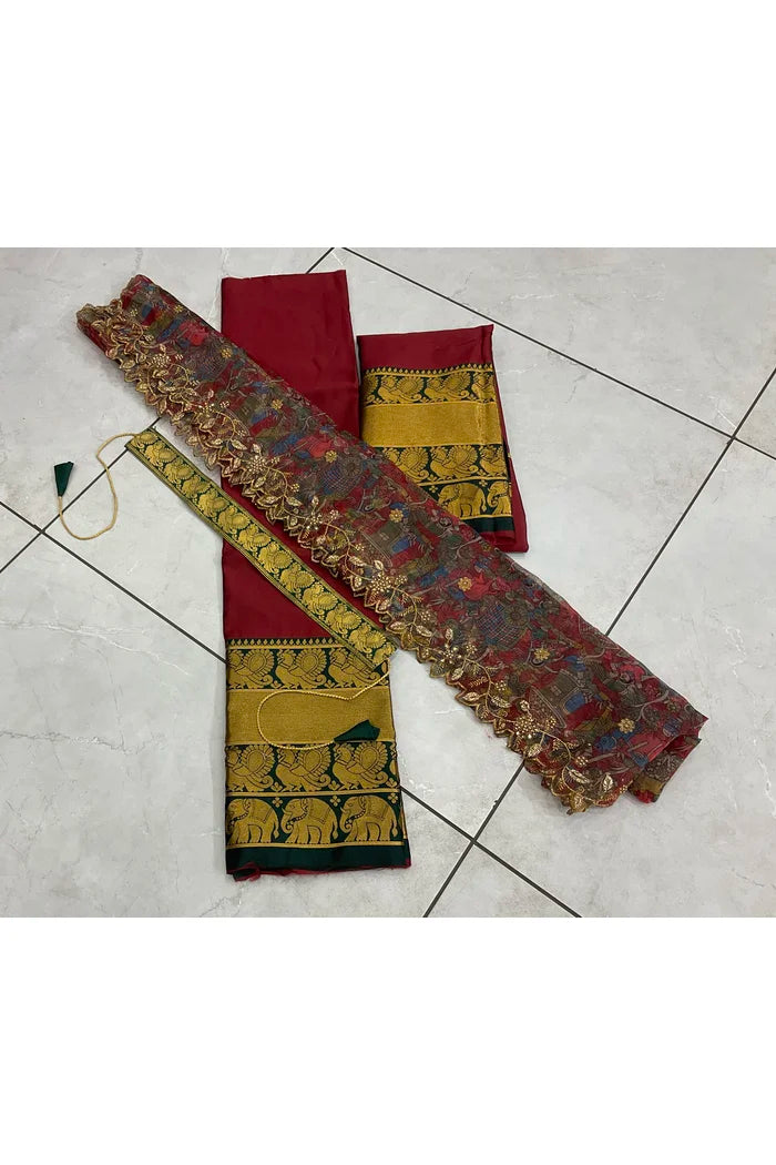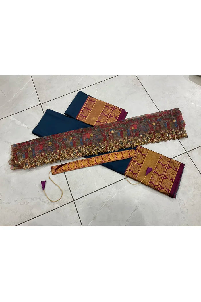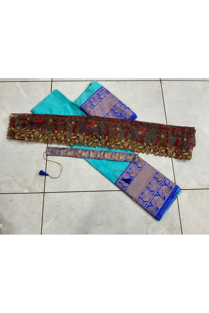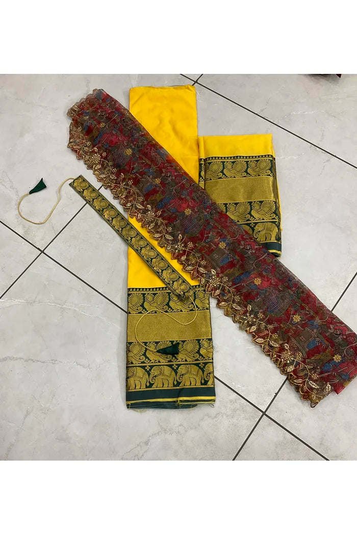 Crafted from Taffeta Satin (Litchi Silk) with intricate Zari work, offering a rich and elegant look.