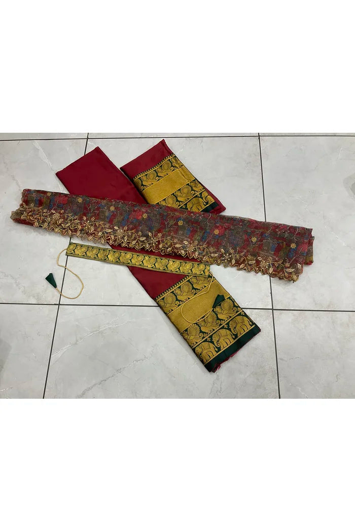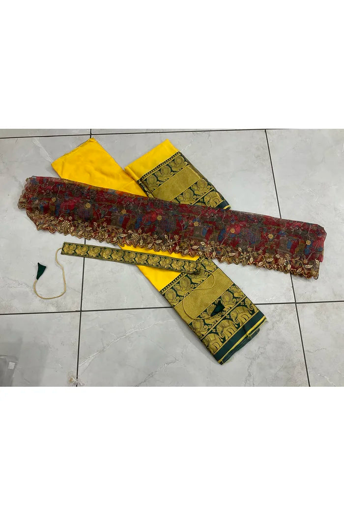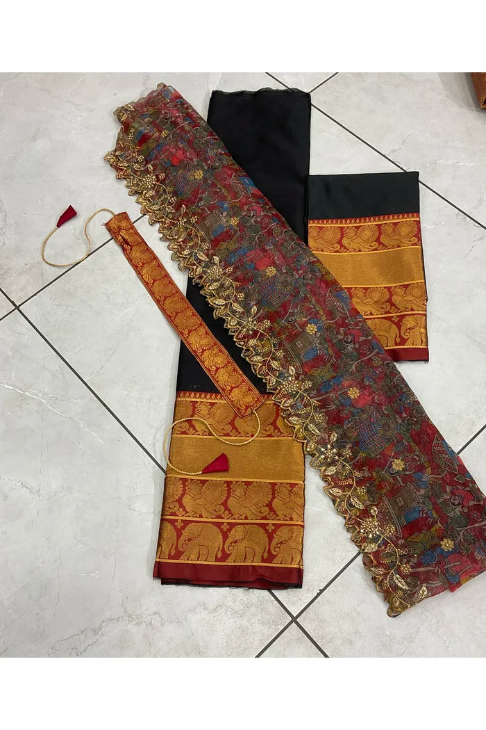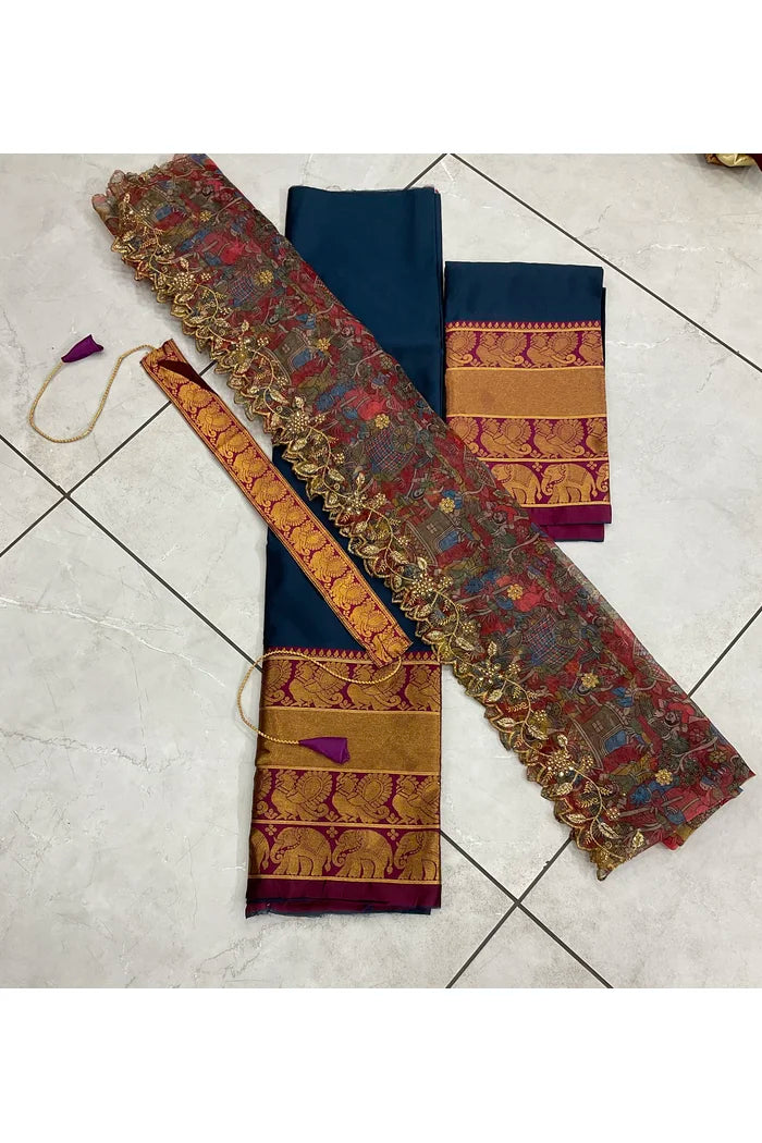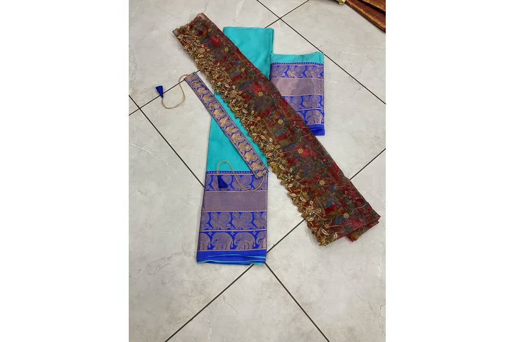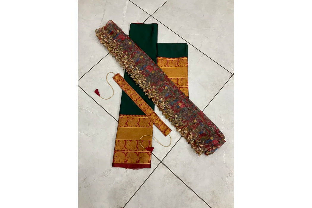 Crafted from Taffeta Satin (Litchi Silk) with intricate Zari work, offering a rich and elegant look.