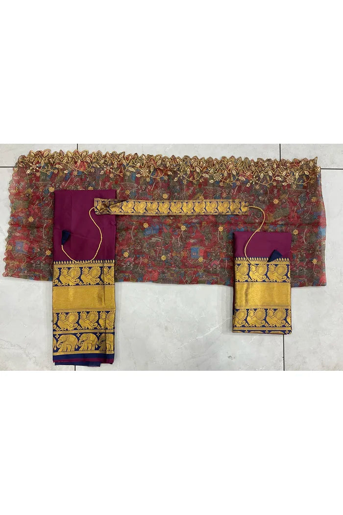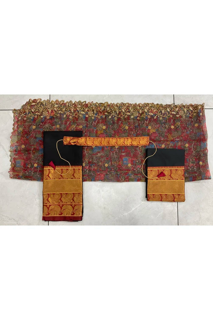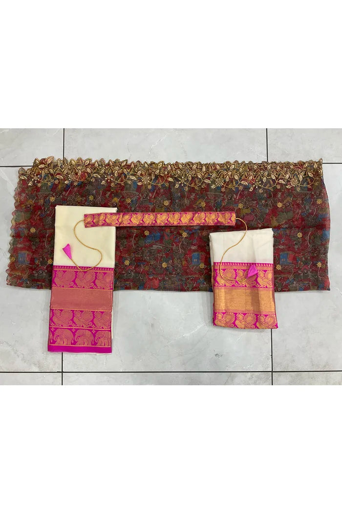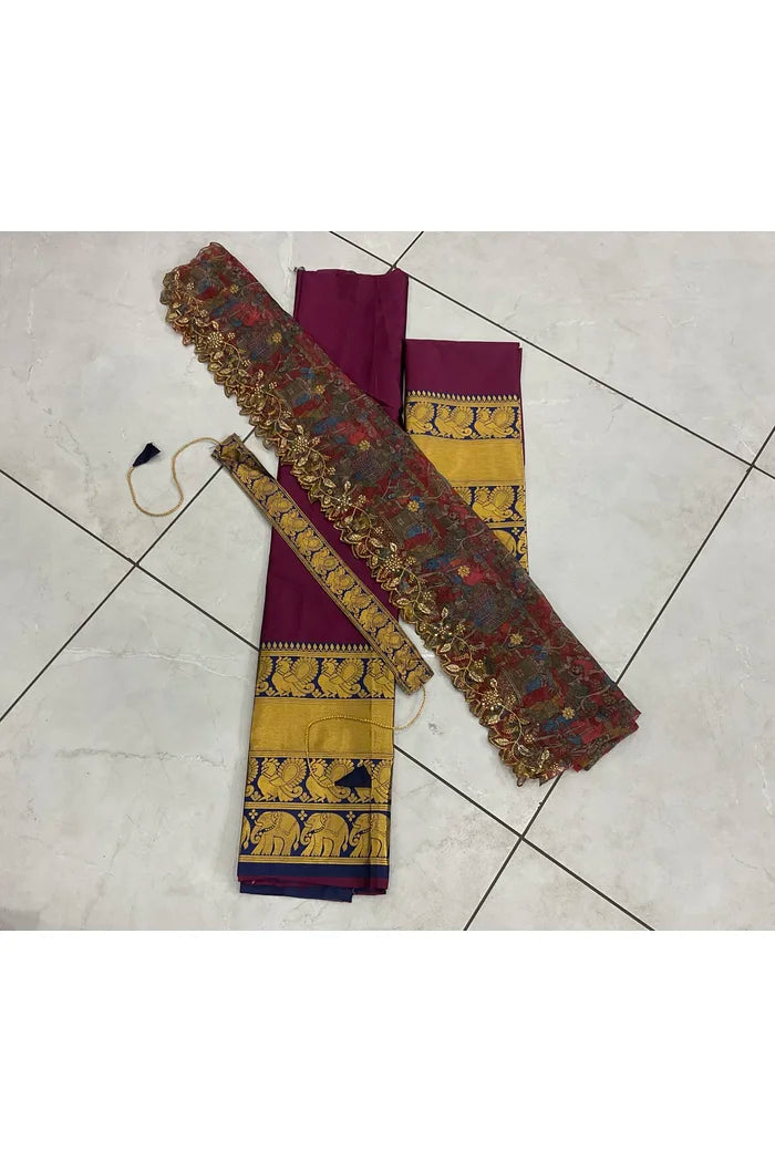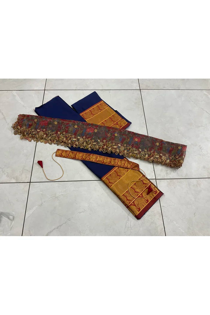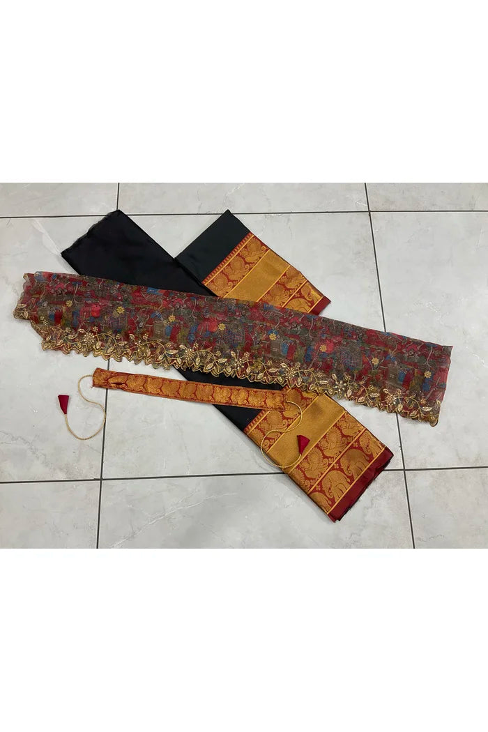 Crafted from Taffeta Satin (Litchi Silk) with intricate Zari work, offering a rich and elegant look.