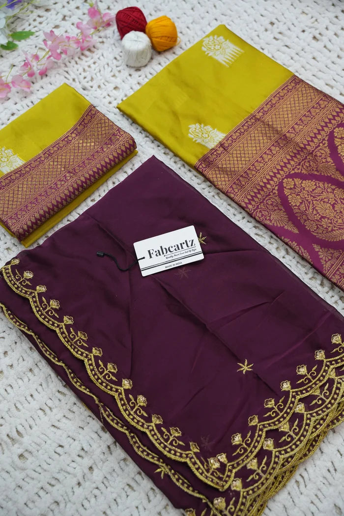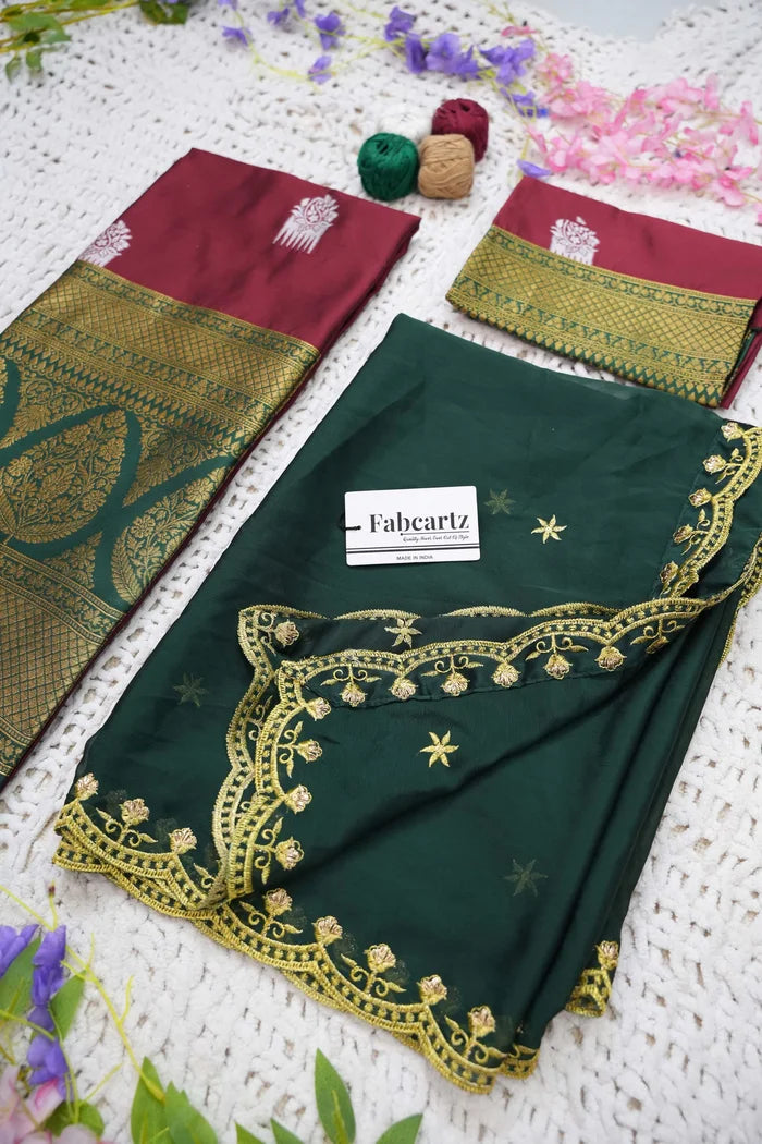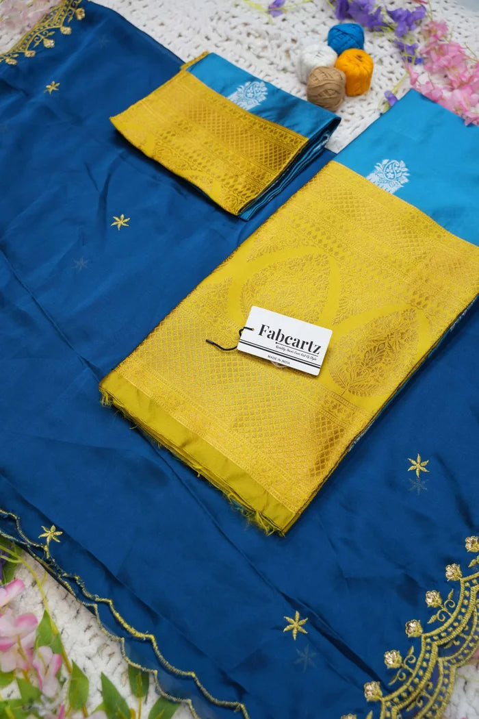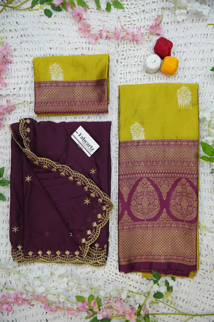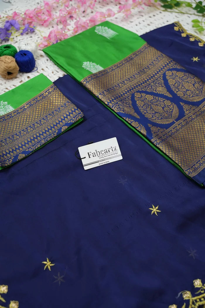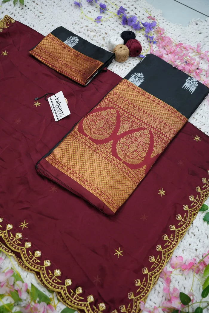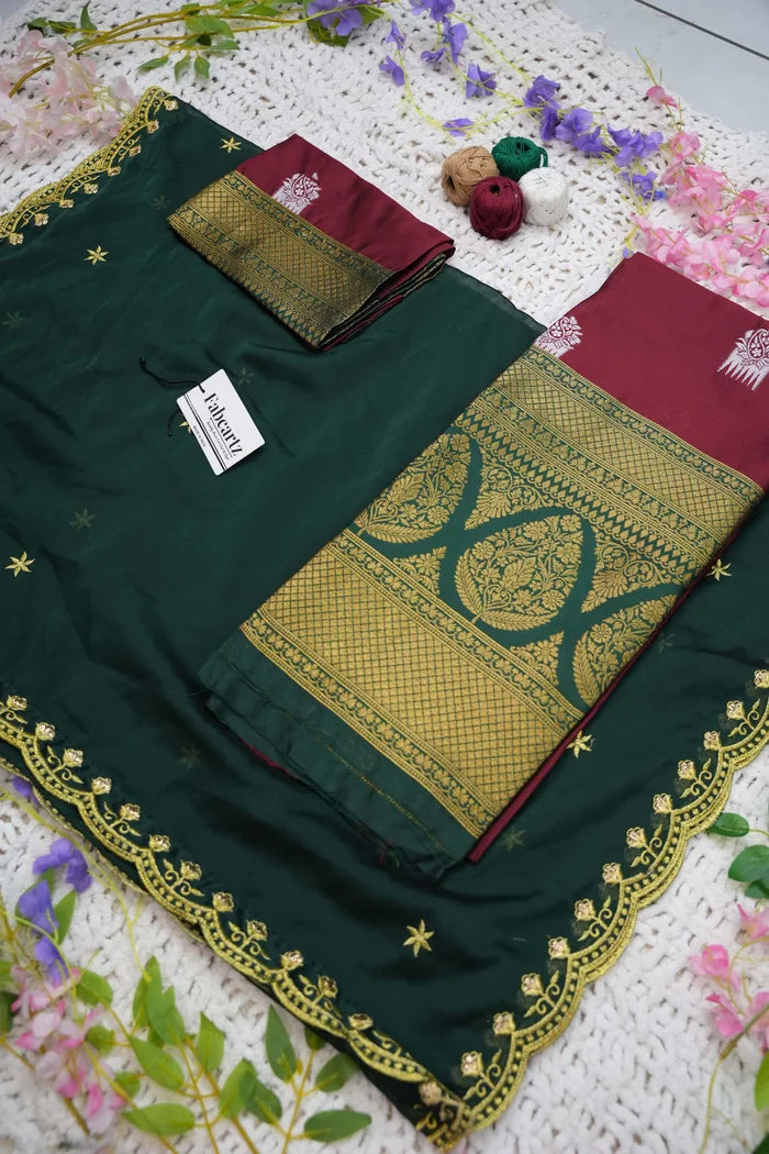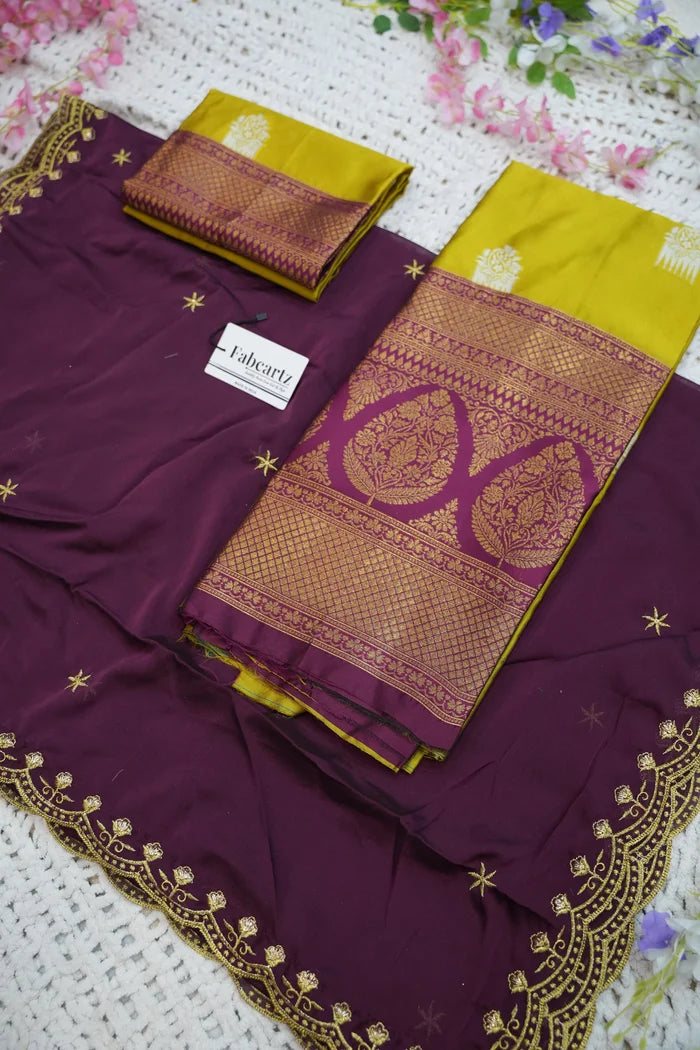 Crafted from Taffeta Satin (Litchi Silk) with intricate Zari work, offering a rich and elegant look.