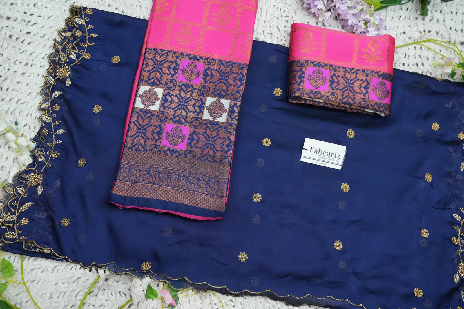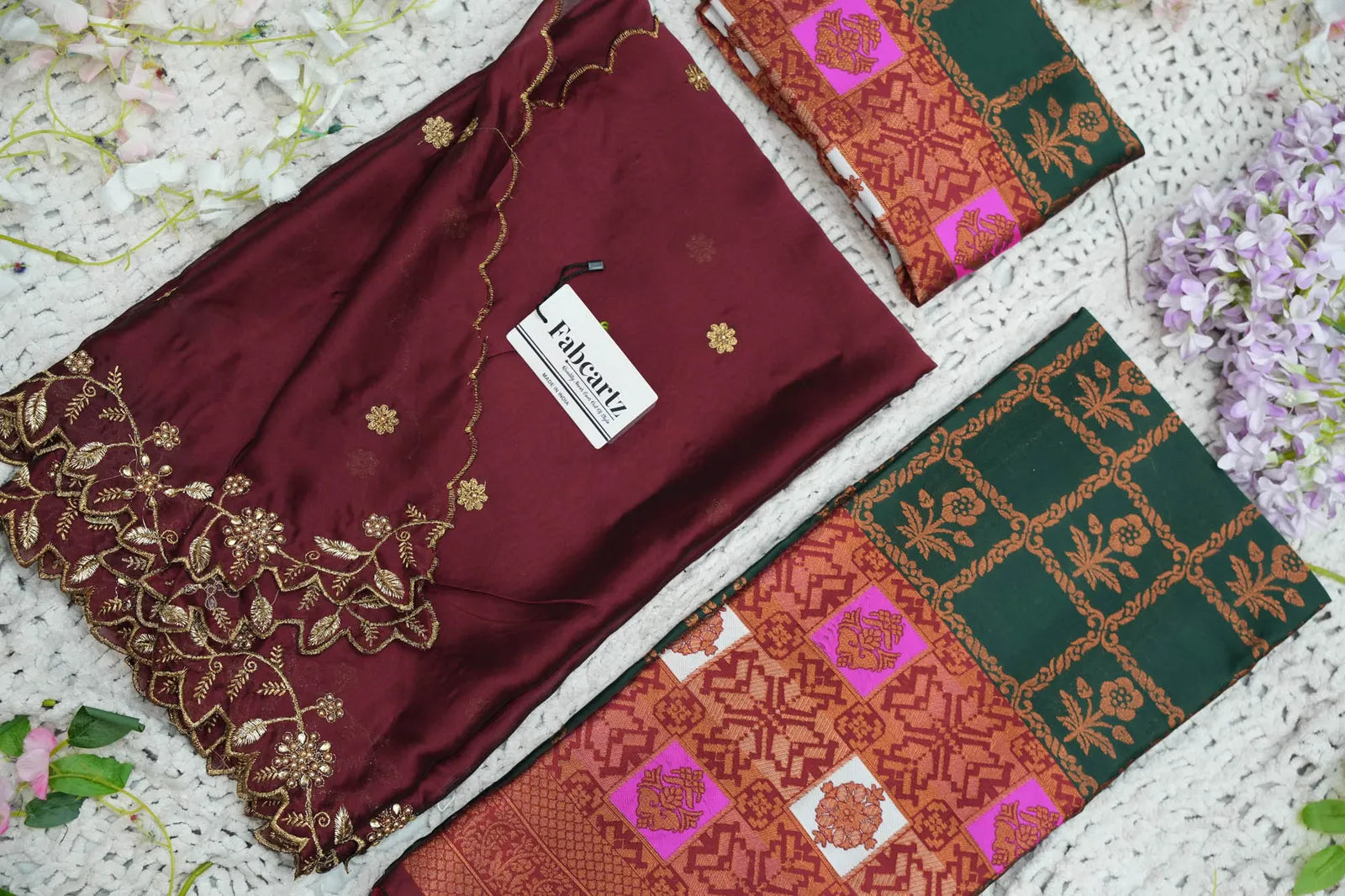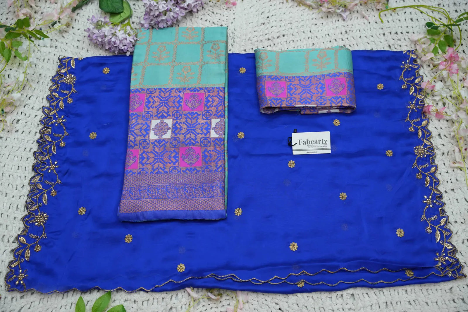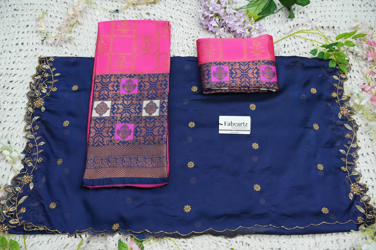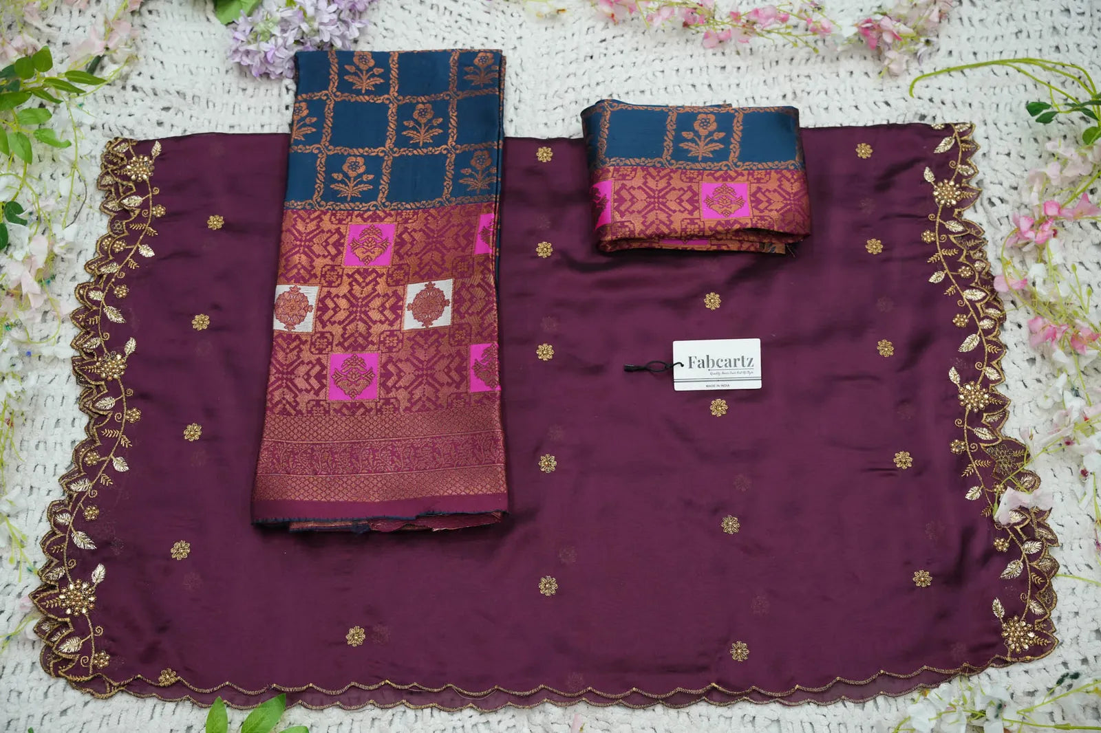 Crafted from Taffeta Satin (Litchi Silk) with intricate Zari work, offering a rich and elegant look.