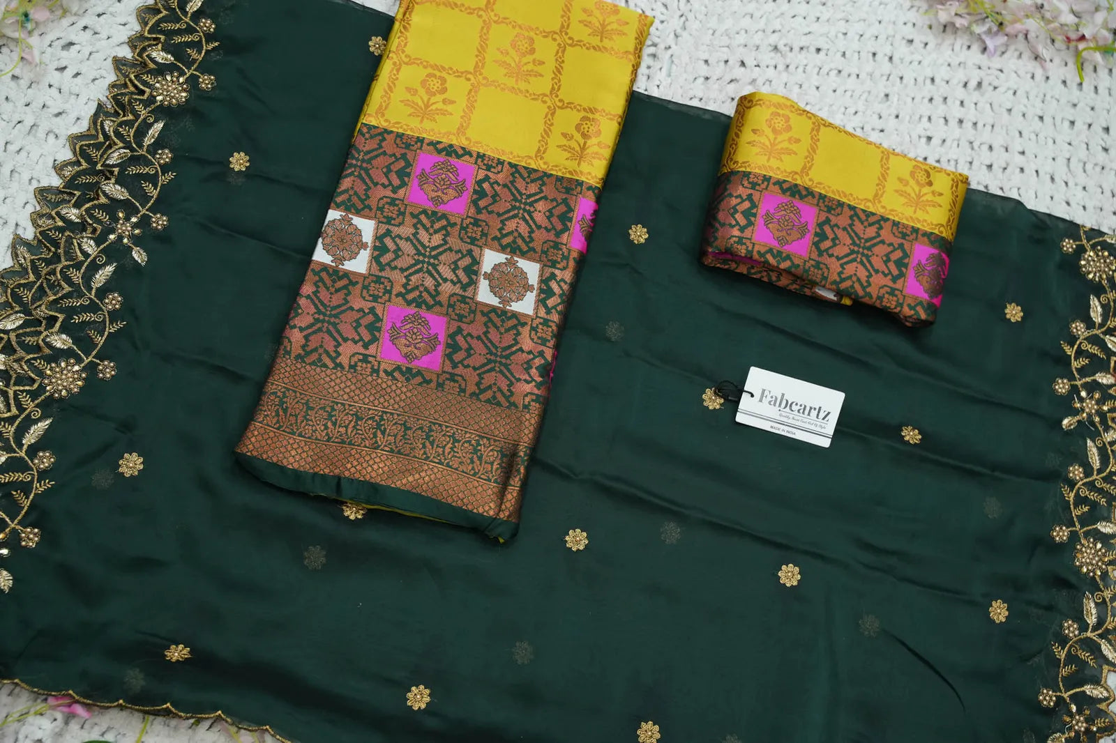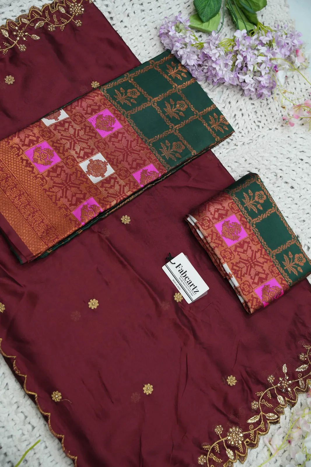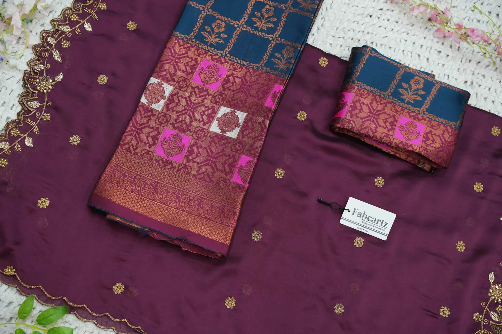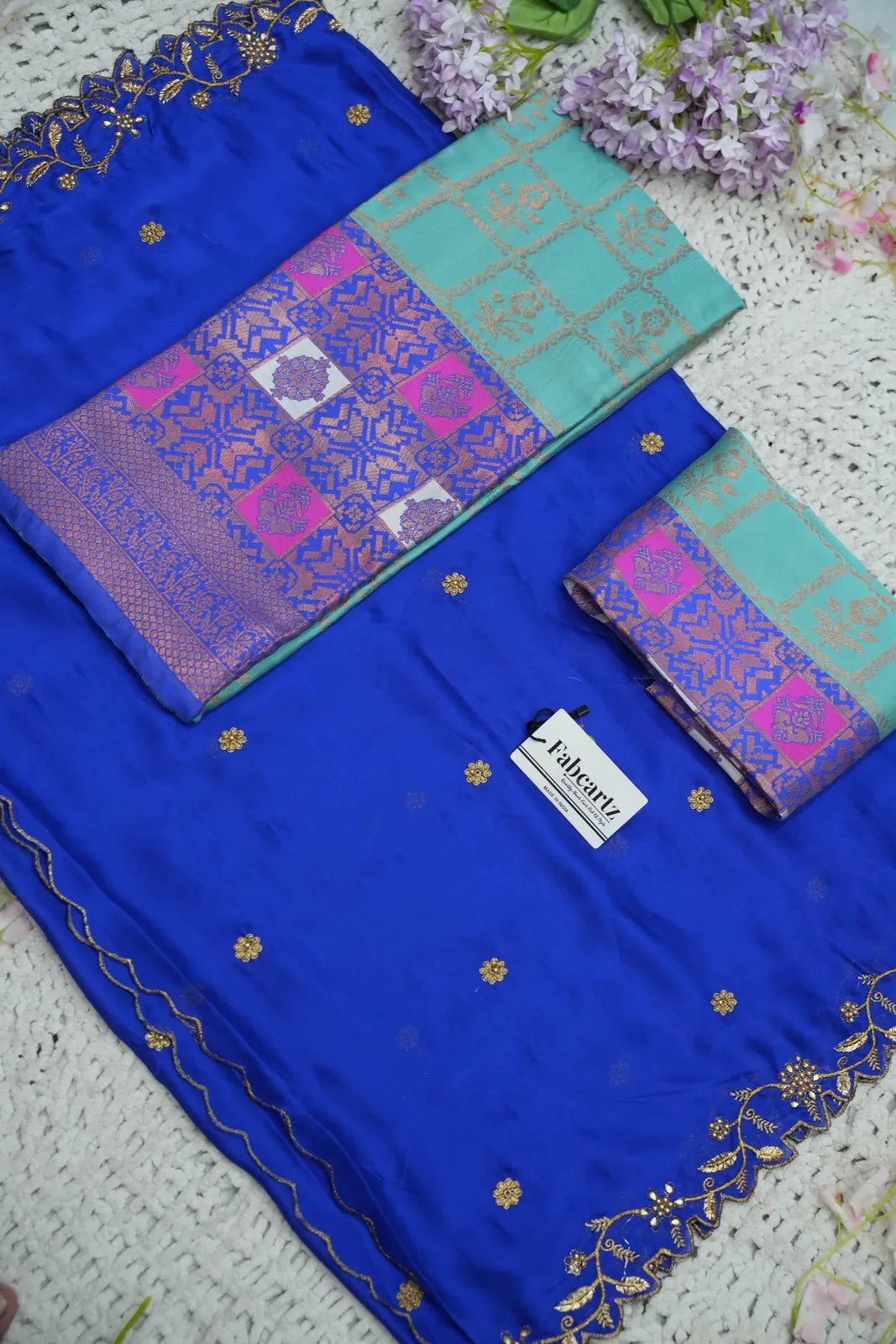 Crafted from Taffeta Satin (Litchi Silk) with intricate Zari work, offering a rich and elegant look.