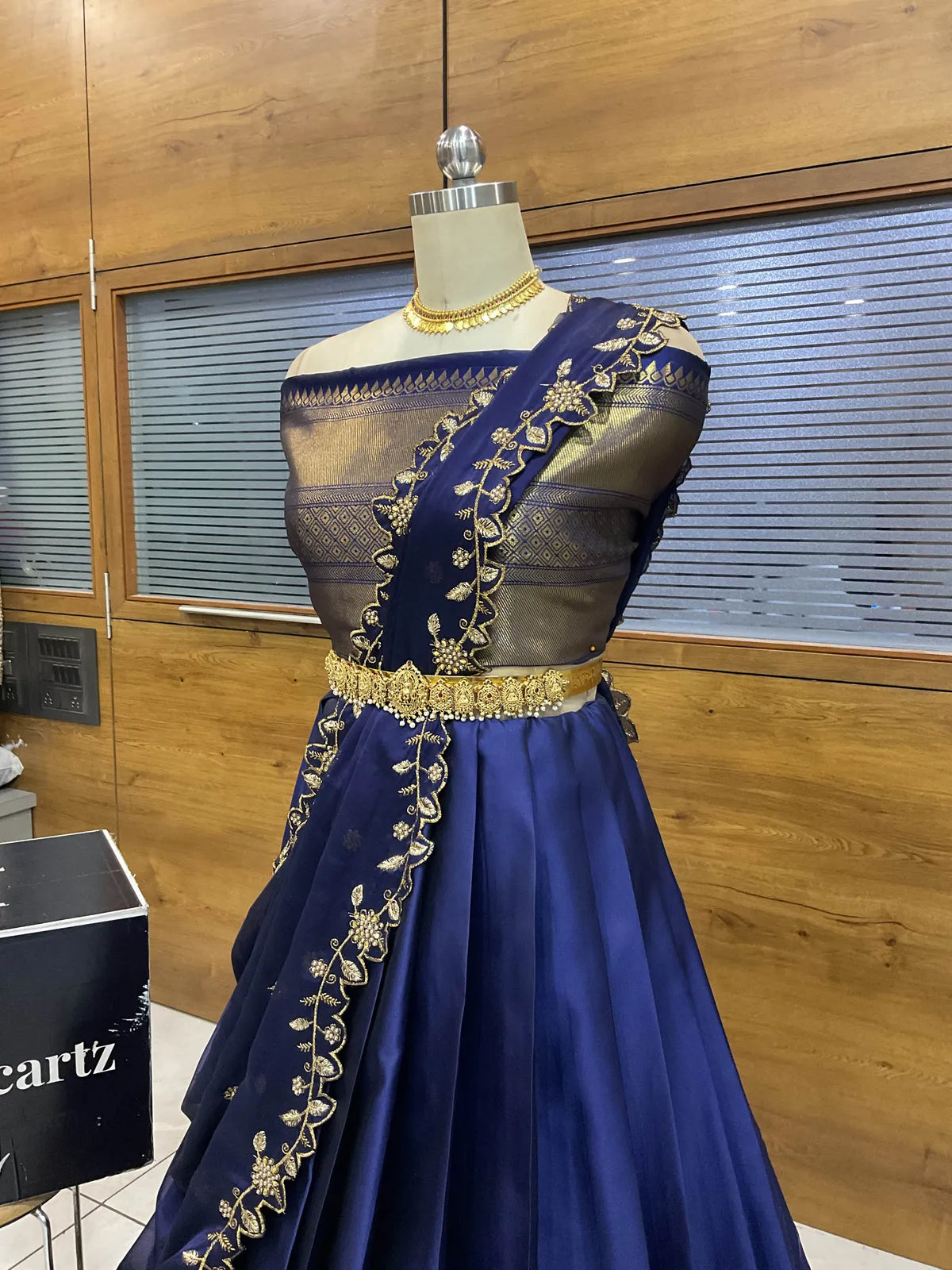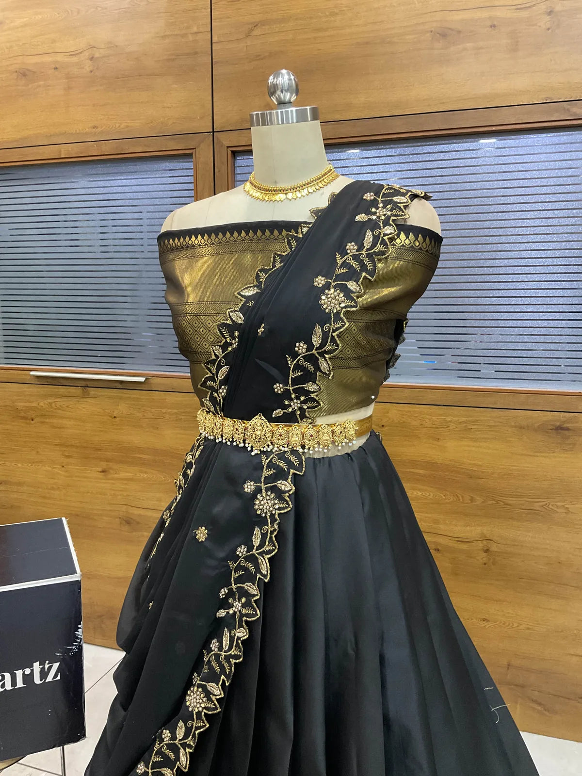 Crafted from Taffeta Satin (Litchi Silk) with intricate Zari work, offering a rich and elegant look.