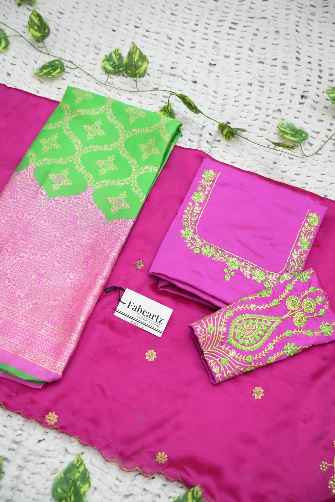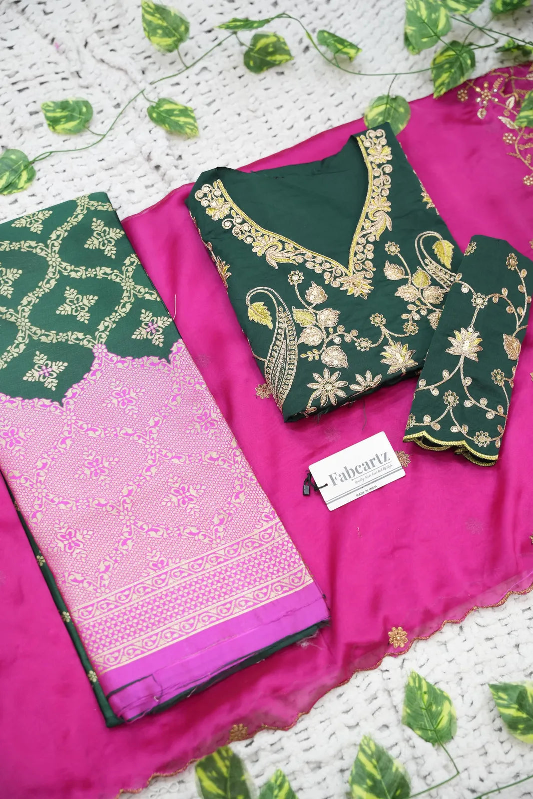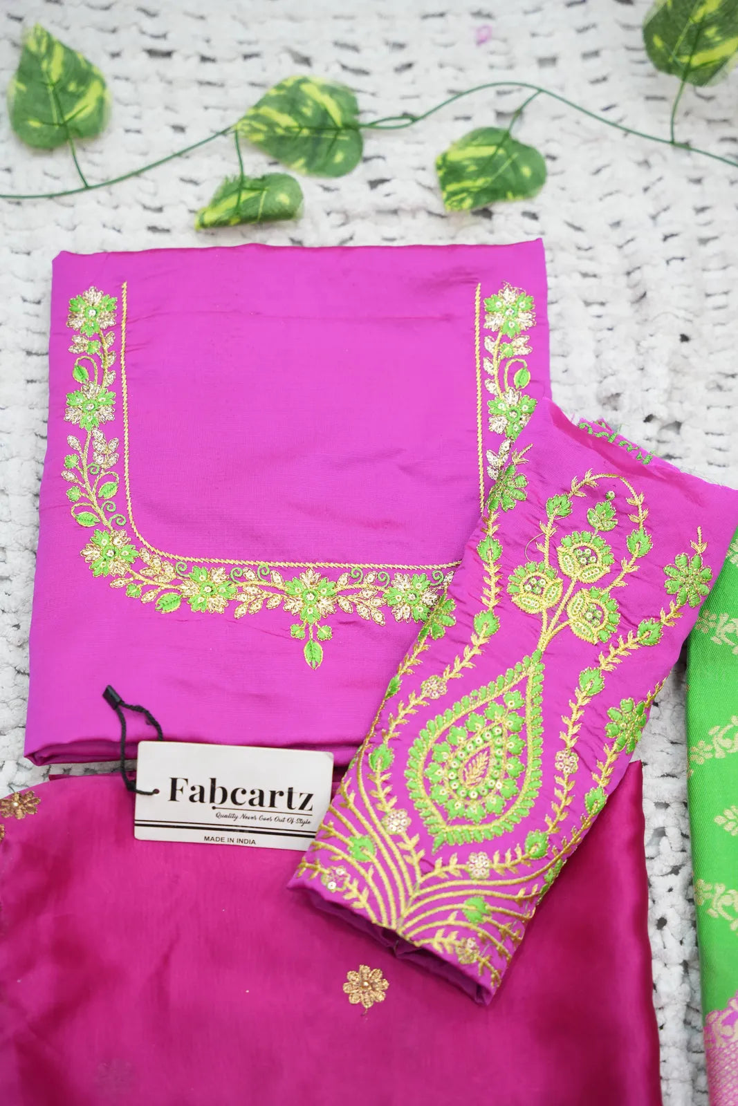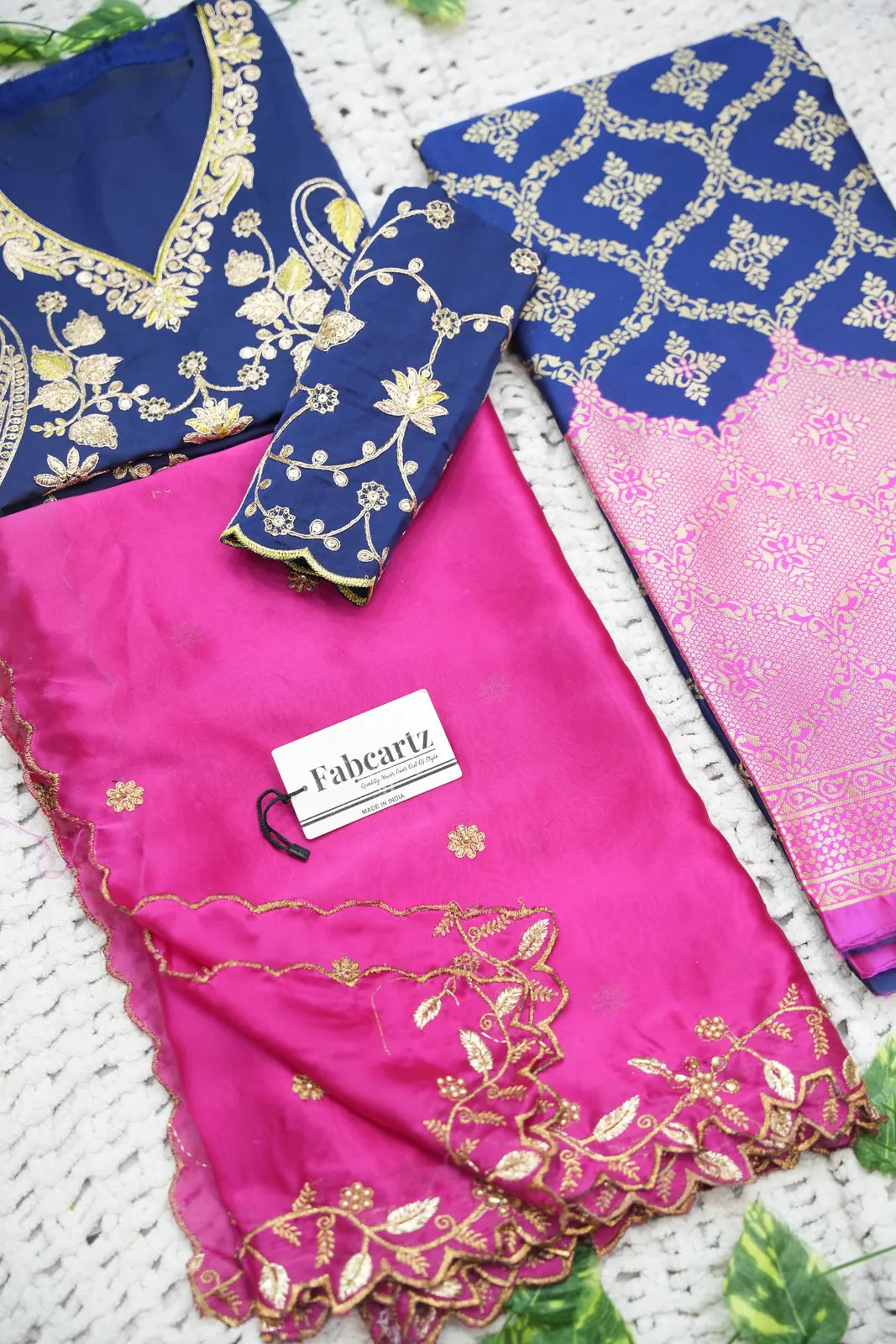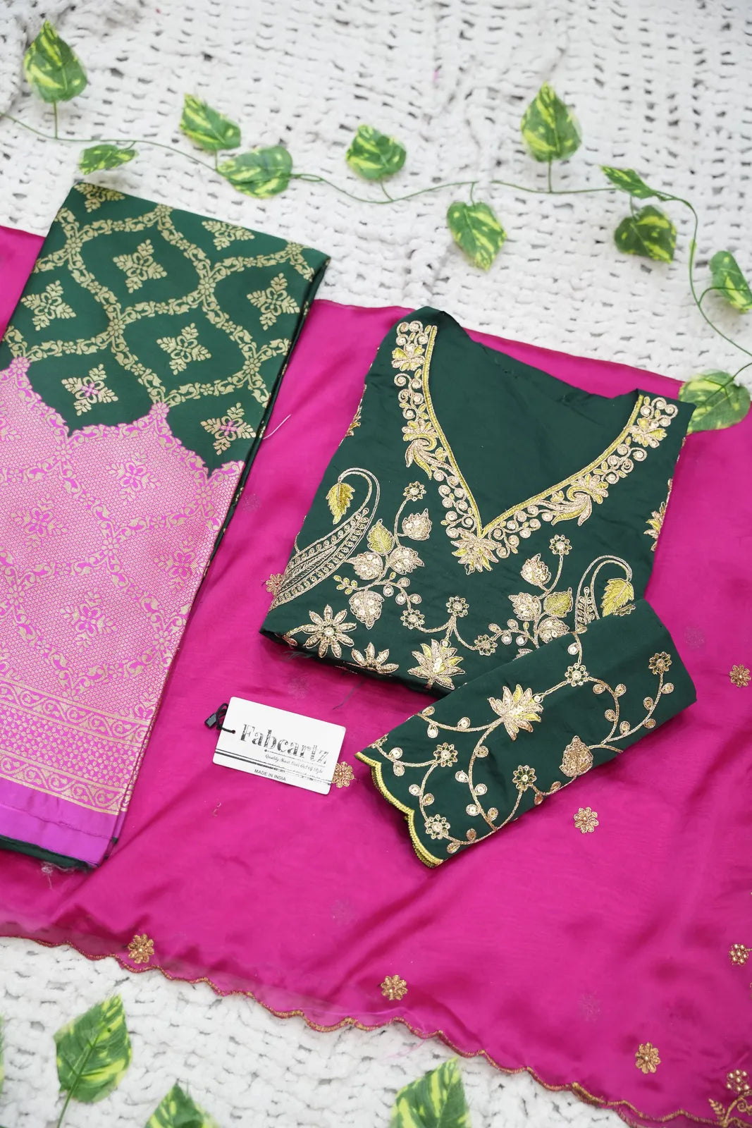 Crafted from Taffeta Satin (Litchi Silk) with intricate Zari work, offering a rich and elegant look.