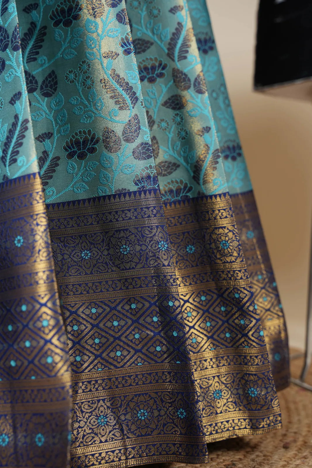 Crafted from Taffeta Satin (Litchi Silk) with intricate Zari work, offering a rich and elegant look.